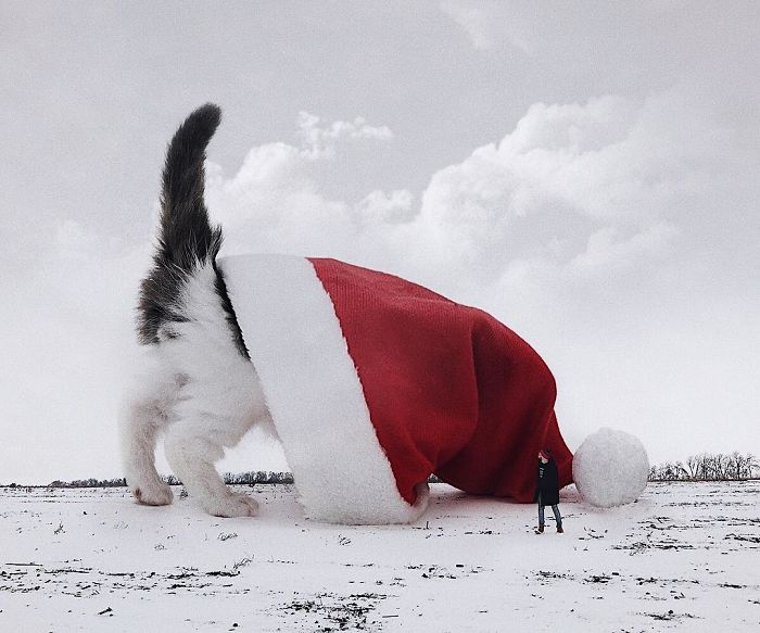 C’est dans un paysage recouvert de neige que l’on retrouve l’artiste, Andre Scherback, habillé en noir. Il se tient a droite sur la photo, il marche en regardant un énorme chaton géant noir et blanc, la quasi totalité de son corp enfoui dans un grand bonnet de père noel rouge et blanc. Seules les deux pattes arrière et la queue noire du chat sortent du bonnet. La scène à lieu dans un champ désolé recouvert de neige, au fond duquel, sur la ligne d’horizon on peut apercevoir quelques arbres sans feuilles. Le temp est gris, le ciel plein de nuage, contrastant avec le rouge écarlate du bonnet et le noir de la queue du chat et des vêtements de l’artiste.