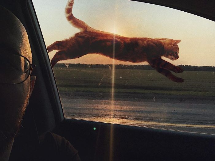 Cette photo est un selfie de l’artiste, c’est a dire que la caméra est tournée vers lui. Sa tête est coupée, sur toute la gauche de la photo. Il est assis dans une voiture, près de la fenêtre sur laquelle il tire notre attention. Le soleil commence à se coucher et un énorme chat roux bondit sur la route cote à cote à la voiture d’Andrei Scherback. Derrière le chat, un champ vert et des arbres sur la ligne d’horizon.